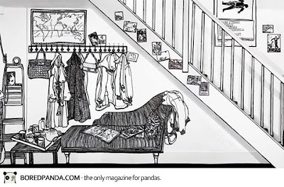Az nem tragédia , ha a lakásod nincs megáldva csodálatos kilátással, vagy nincsenek viktoriánus stílusú bútoraid. Vagy legalábbis ez nem tragédia, egy brit művész, Charlotte Mann számára.- amit elképzel ő megrajzolja, a sima fehér falakra, egyszerű fekete filctollal. Az ő filctoll rajzai annyira aprólékosak, hogy úgy néznek ki, mintha fali freskók lennének, és egy berendezett szoba benyomását keltik. Ha azt hinnéd szédítő a filcek illata tévedsz, mert Charlotte speciális, szagtalan vizes filctollat használ munkáihoz .Tehát, ha arra gondolnál hogy, felújítod a sima fehér falaidat, vagy számít, hogy mennyibe fog kerülni a berendezés, úgy Charlotte ötletét alkalmazhatod, feltéve ha a rajzkészséged ilyen bravúros.